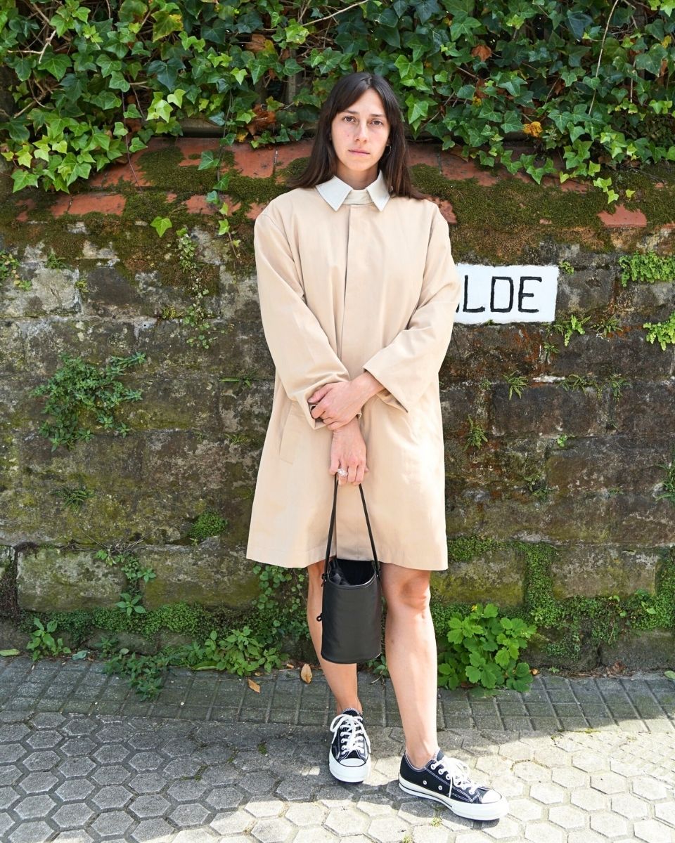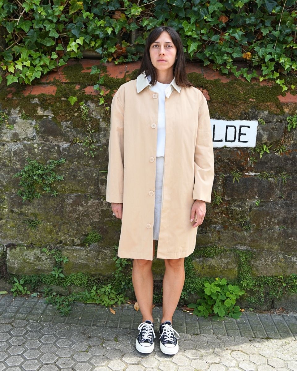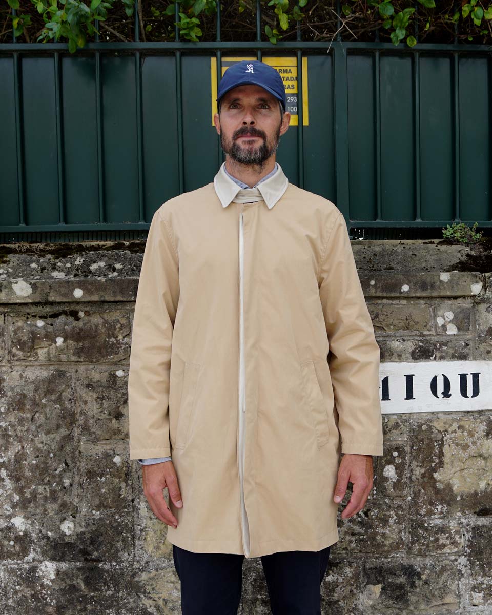La versión en gabardina azul marino con cuello negro es la más clásica y la que más nos conecta con nuestra herencia vasca. La opción en verde musgo con cuello rojo nos transporta a los paisajes de la campiña británica, una de las fuentes de inspiración de la marca. La propuesta en beige con cuello blanco evoca el estilo de las firmas contemporáneas y escandinavas, aportando un aire fresco y actual.