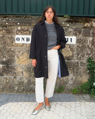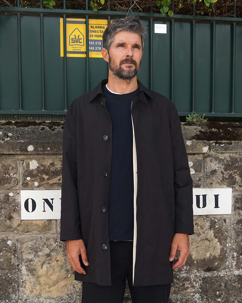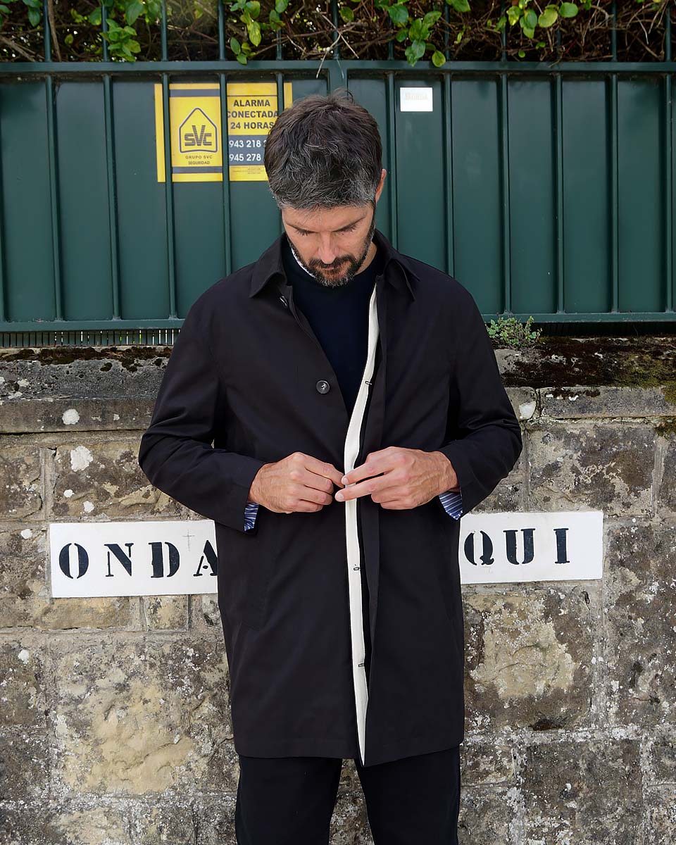 La versión en gabardina azul marino con cuello negro es la más clásica y la que más nos conecta con nuestra herencia vasca. La opción en verde musgo con cuello rojo nos transporta a los paisajes de la campiña británica, una de las fuentes de inspiración de la marca. La propuesta en beige con cuello blanco evoca el estilo de las firmas contemporáneas y escandinavas, aportando un aire fresco y actual.